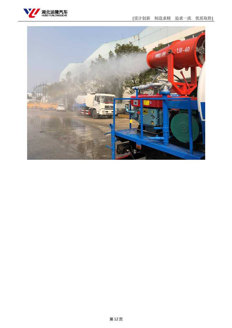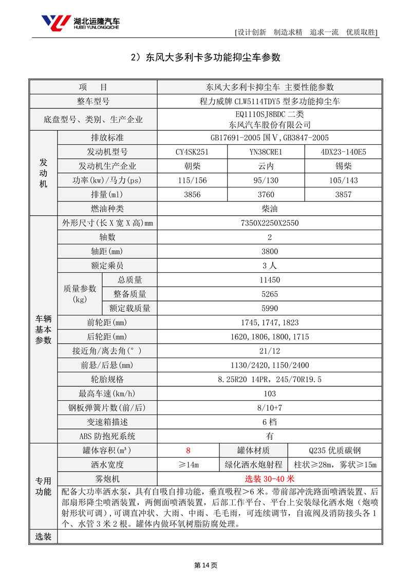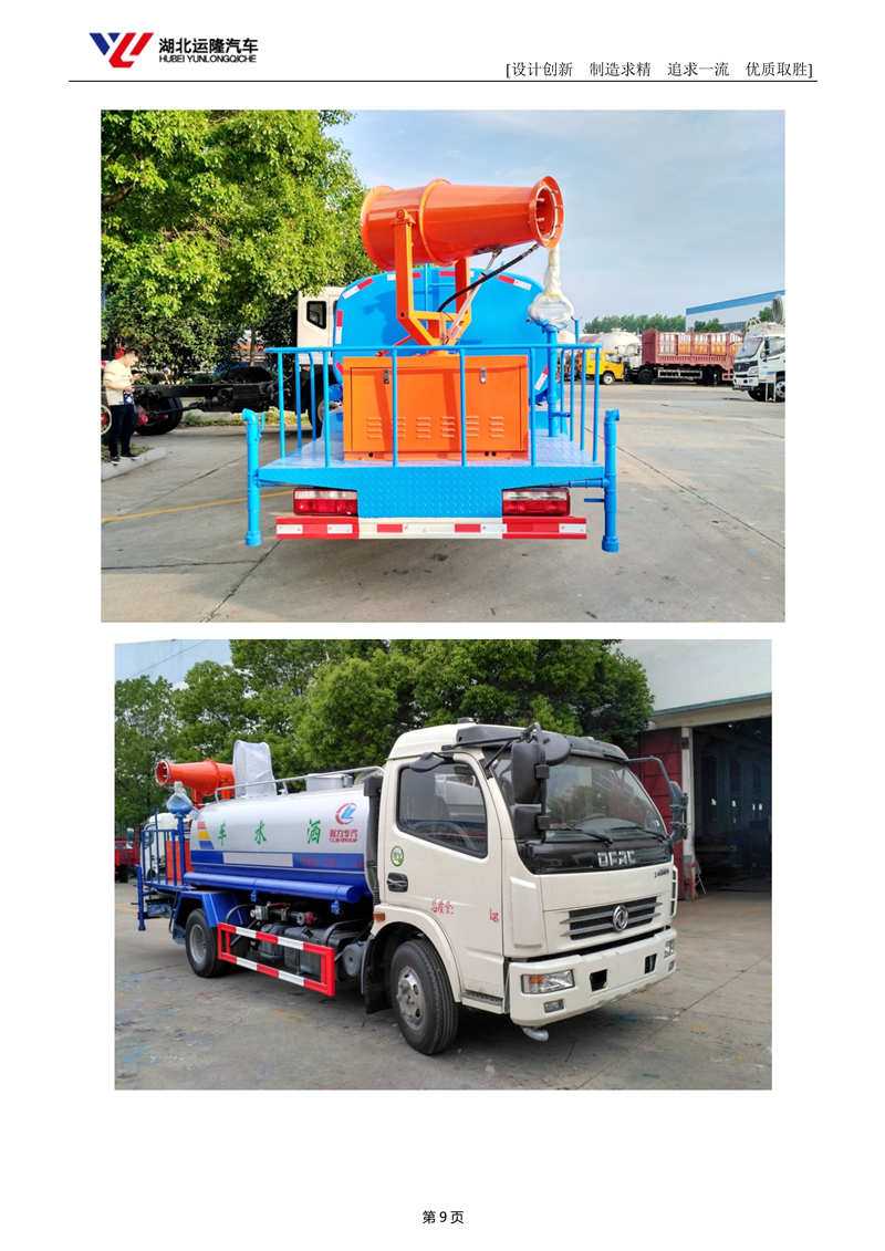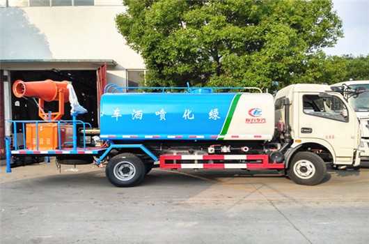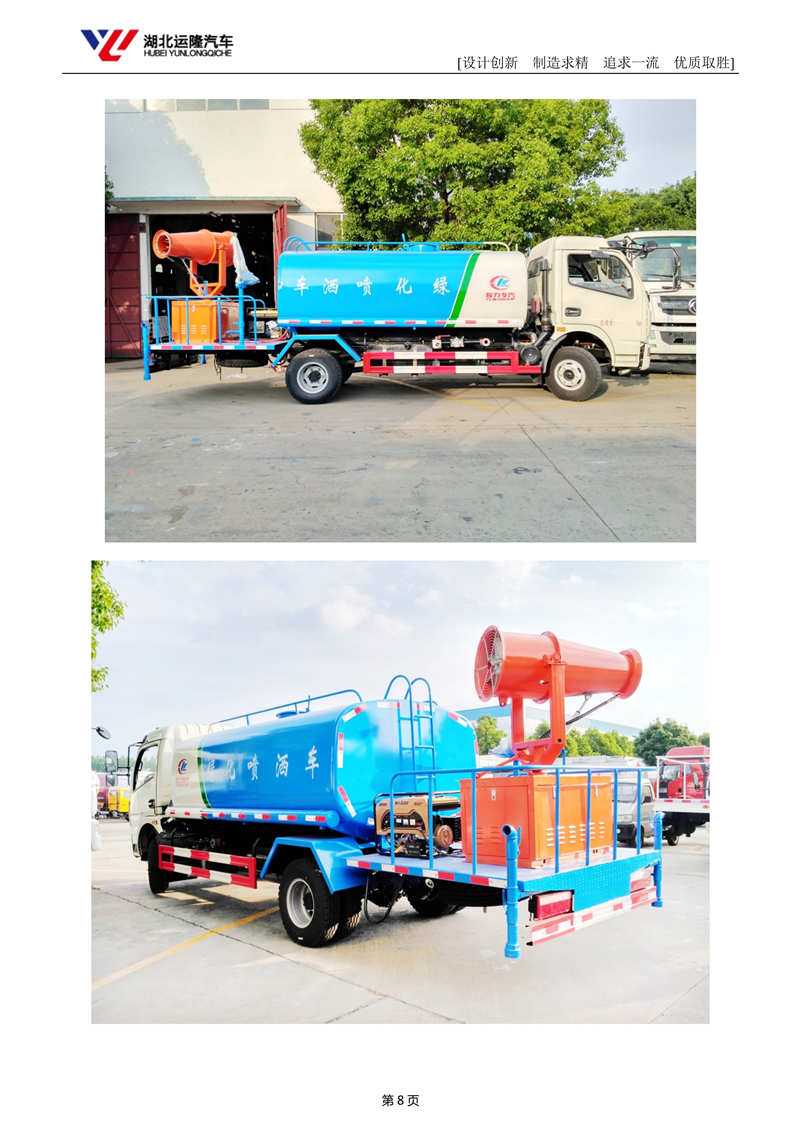 上裝配置:罐體容積為 8立方多功能抑塵灑水車,風送式霧炮機射程30米/40米,罐體鋼板為4mm碳鋼Q235材質,罐內隔板具有防波作用,以減輕汽車行駛時罐體液體沖擊,罐體及整車外形尺寸按照公告。帶大功率專用灑水泵,泵可自吸自排,整車前沖、后灑、側噴、帶65消防接口,后平臺配CLW-30/CLW-40型風送式霧炮機組;汽油/柴油發電機組;遠程遙控系統控制;霧炮自動旋轉角度0-360°。后平臺帶綠化灑水炮,灑水炮可全方位旋轉,可連續調成直沖狀、大雨、小雨、毛毛雨;前封頭帶水位計,后平臺主管路帶1寸澆花接口,后爬梯。平臺后部帶小安全告知牌:“隨時停車,注意安全”,帶兩根水管及陰陽端。罐體顏色:白/蘭/綠,罐體兩側噴“灑水車、綠化噴灑車”字樣,貼反光標示。