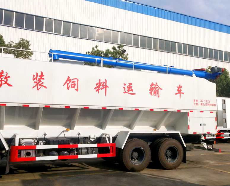 散裝飼料車的飼料罐架設在卡車的底盤上,專用設施由罐體總成、輸送系統(水平卸料系統、垂直卸料系統以及活動卸料系統組成)、散裝飼料車罐液壓系統(高壓油泵經管路與分配閥連接該閥的三個輸出端分別是轉角液壓馬達、升降油缸以及串聯在一起的水平卸料、垂直卸料、活動卸料液壓馬達)、散裝飼料車罐電動系統、氣動分倉機構等組成。在罐體底部設有閘門,在閘門下面裝有水平螺旋輸送器(俗稱水平攪籠),由取力器由汽車變速箱輸出動力驅動,再傳動高壓油泵以驅動液壓系統,散裝飼料車罐液壓馬達通過傳動裝置帶動水平螺旋輸送器的葉片軸及葉片旋轉,經活動輸送系統(俗稱活動攪籠)以將飼料輸出。車頂平置的一根活動卸料絞龍可自由回轉和抬升,運輸時頂部的螺旋管平臥在罐頂;卸料時則抬起,散裝飼料車罐使管端的出料口與畜禽飼養場貯料罐頂部的進料門相接、對準,完成卸料。